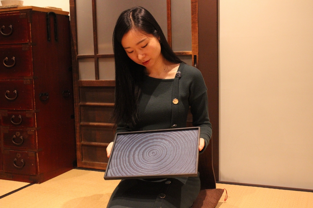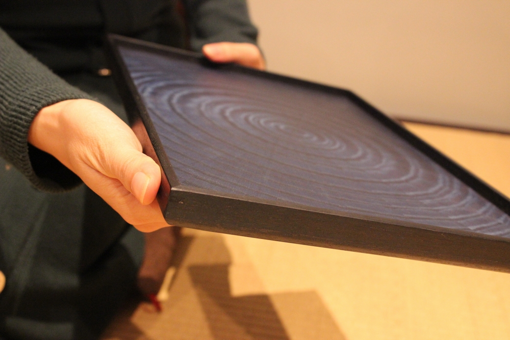 「木目を活かしていて、藍の自然な色味で、パッと見ただけですごく美しい。こういう質感の和紙もあるので、触らなければ和紙だと思う方もいらっしゃる気がします。おぼんを持ったときに手に当たる角もおぼんの端も丸く加工されているので、持ったときの感触も良くて。使う場面を細やかなところまで考えているなと思いました。インテリアとして飾っても素敵ですよね」