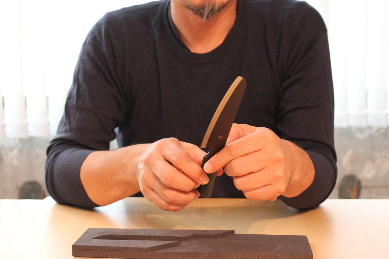 まず服部さんが手にとったのは、DYKの包丁。誰でも扱いやすいように、やや小ぶりのサイズで作られています。この包丁、grafがコンセプト立案、クリエイティブディレクションを手がけた大分県別府市のアートホテル「ガレリア御堂原(みどうばる)」の客室に採用したんだそうです。